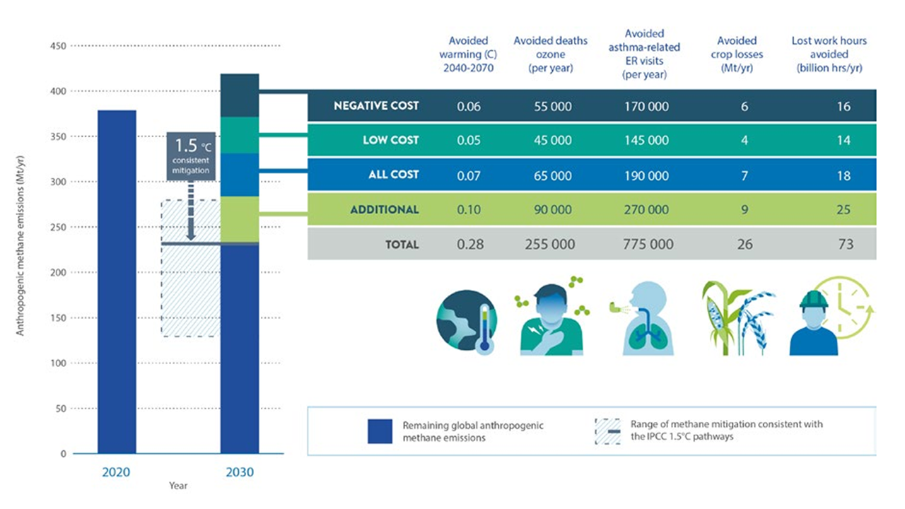 - National governments have signed the Global Methane Pledge to reduce methane emissions by 30% in 2030 compared to 2020, potentially preventing 255,000 premature deaths, 775,000 asthma related hospital visits, 73 billion hours of lost labour from extreme heat and 26 million tonnes of crops losses globally